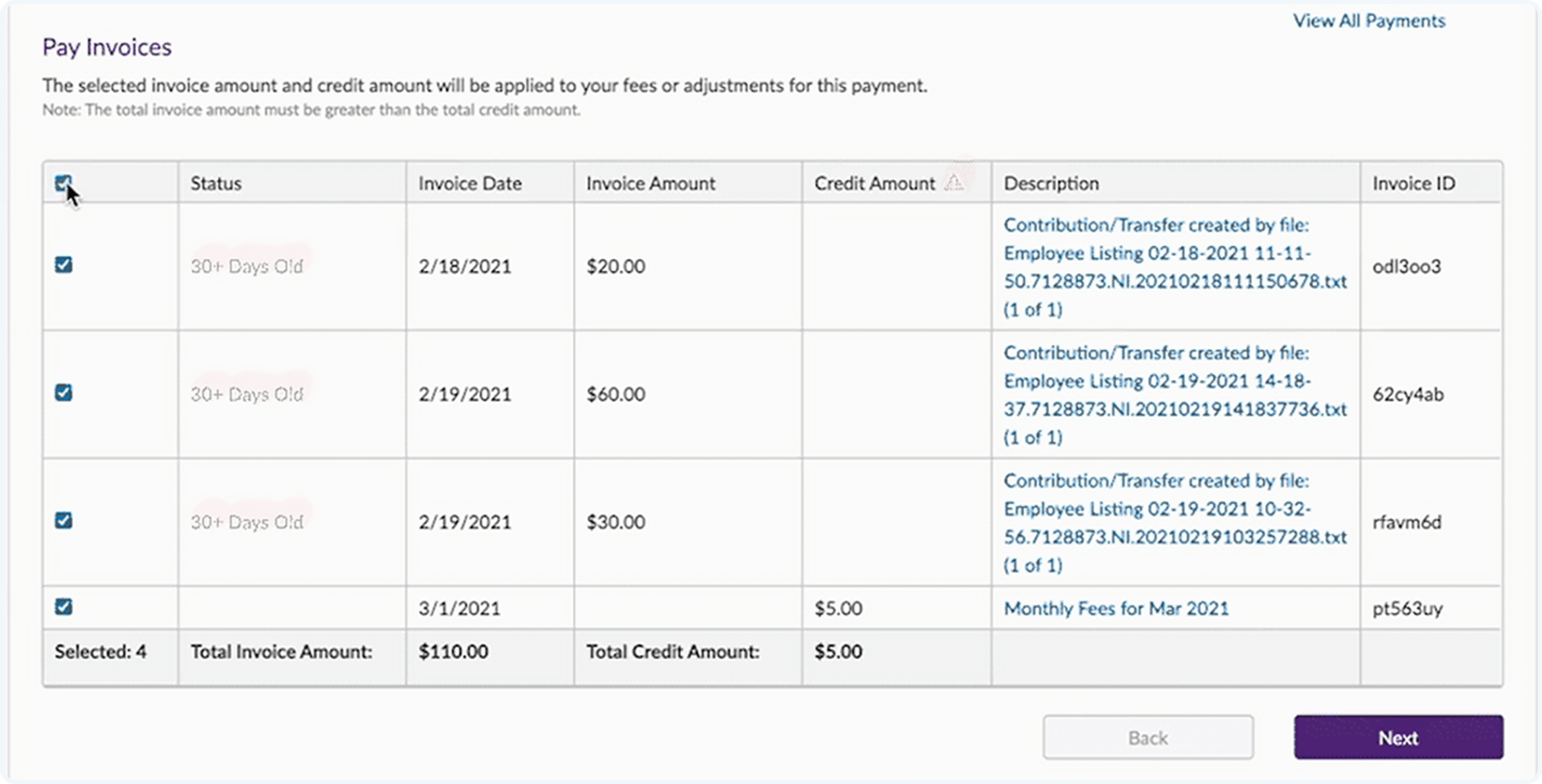 Review and pay outstanding invoices, with views categorized by fees, contributions, and more.